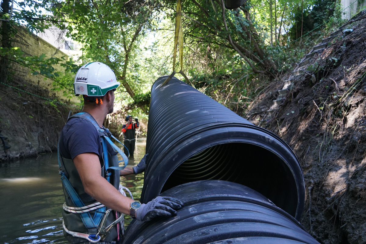 - Dérivation du flux amont par canalisation annelée DN800 sur 18 mètres.