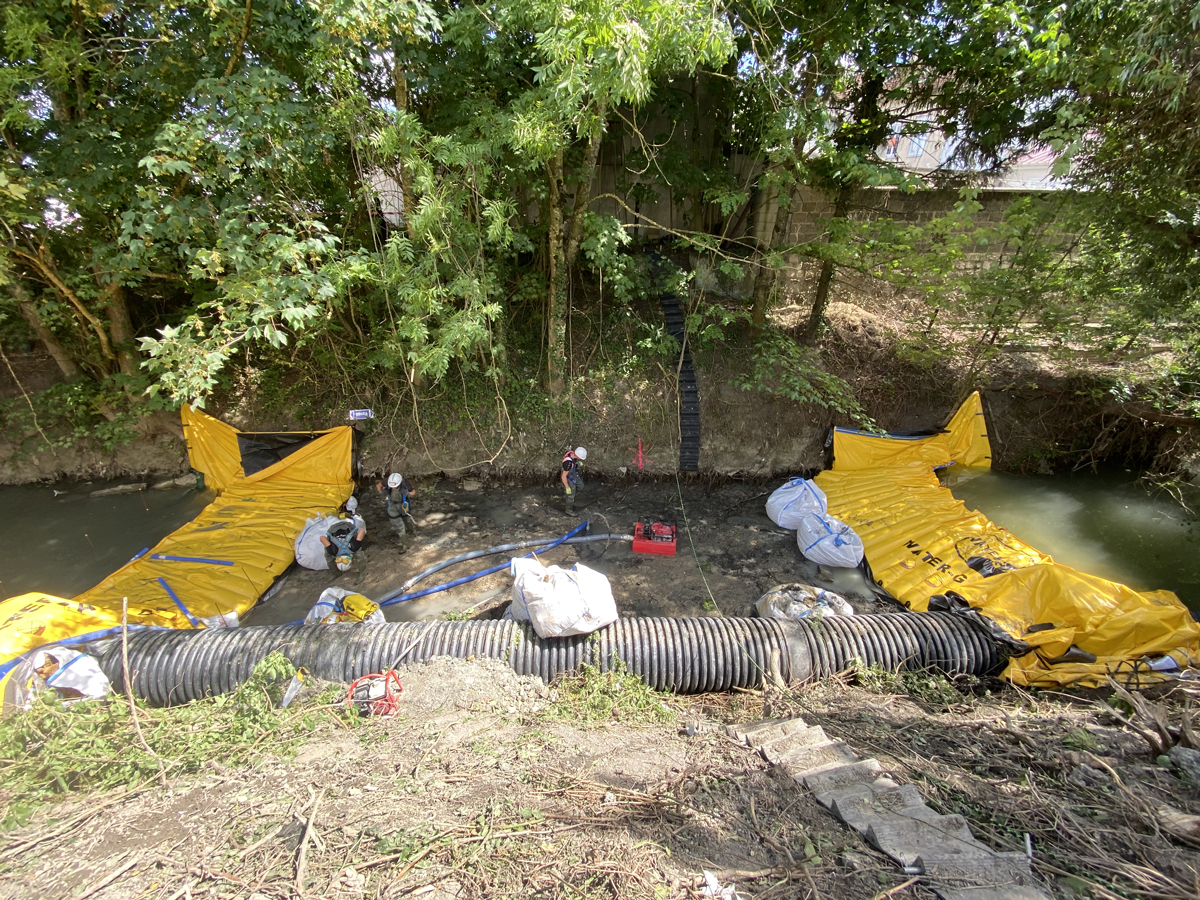 Isolement hydraulique d’une section de rivière entre deux batardeaux souples WA-3950 tête-bêche avec dérivation DN800 pour réparation urgente d’une conduite d’eaux usées fracturée.