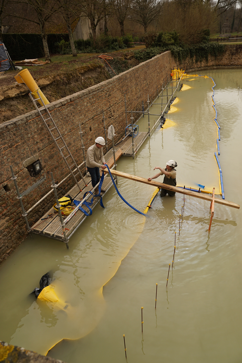 Rénovation des douves – Château de Chamerolles : mise en assec en U