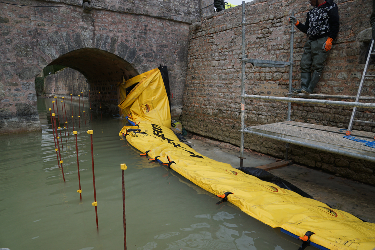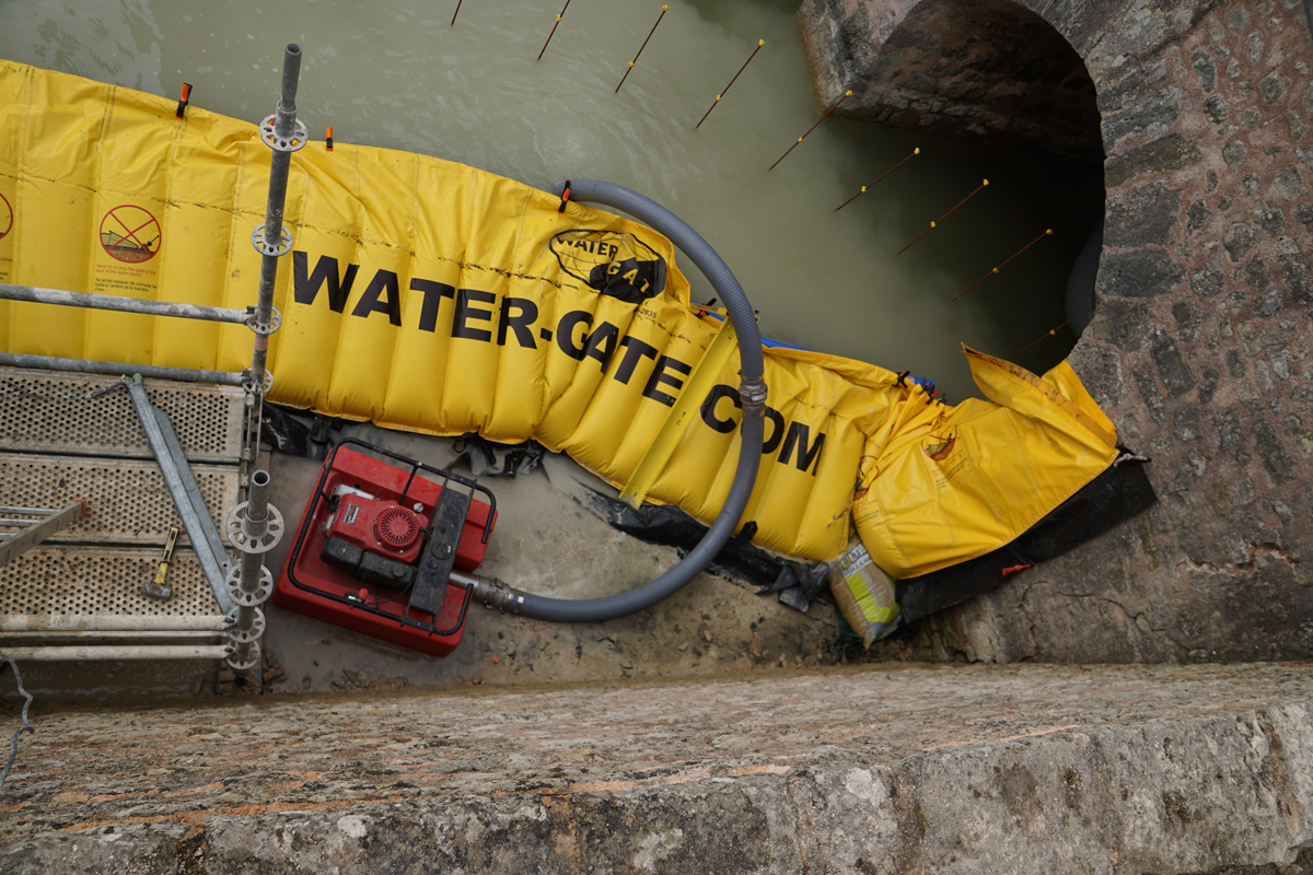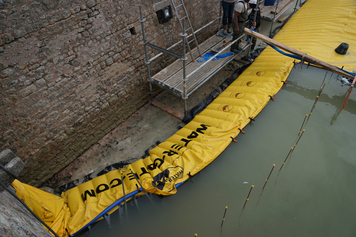 Assèchement localisé des douves pour reprise de fondations et rejointoiement du mur, avec batardeaux souples Water-Gate© en installation en U, pompage et appui sur échafaudage.